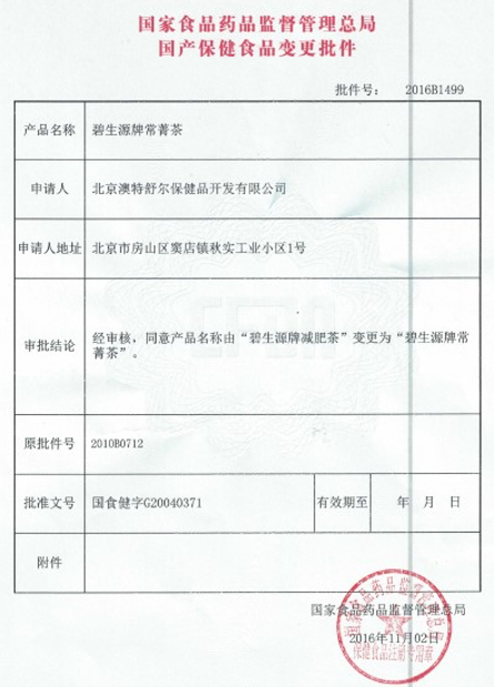 (國家食品藥品監(jiān)督管理總局對(duì)碧生源牌減肥茶名稱變更的批件)